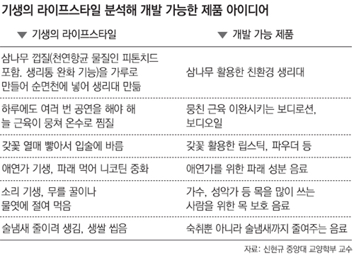 ½Å ±³¼ö´Â ¡°±â»ýµéÀÇ ¶óÀÌÇÁ½ºÅ¸ÀÏÀ» ºÐ¼®ÇÏ¸é ´Ù¾çÇÑ Á¦Ç°À» °³¹ßÇÒ ¼ö ÀÖ´Ù¡±°í ¼³¸íÇß´Ù. ´ã¹è¸¦ Áñ±â´ø ±â»ýµéÀº ÆÄ·¡¸¦ ¸Ô¾î ´ÏÄÚÆ¾À» ÁßÈÇß´Ù. ÀÌ Á¡¿¡ ÁÖ¸ñÇÏ¸é ¾Ö¿¬°¡¸¦ °Ü³ÉÇØ ÆÄ·¡ ¼ººÐÀ¸·Î ¸¸µç À½·á¸¦ °³¹ßÇÒ ¼ö ÀÖ´Ù. ¸íâ(Ù£óÝ)À¸·Î ´ëÁ¢¹Þ´ø ¡®¼Ò¸® ±â»ý¡¯Àº ¸ñÀ» °ü¸®Çϱâ À§ÇØ ¹«¸¦ ²ÜÀ̳ª ¹°¿³¿¡ Àý¿© ¸Ô¾ú´Ù. ½Å ±³¼ö´Â ¡°°¡¼öó·³ ¸ñÀ» ¸¹ÀÌ ¾²´Â »ç¶÷À» À§ÇØ ¸ñÀ» º¸È£ÇÏ´Â À½·á¸¦ ¸¸µé¾î º¼ ¸¸ÇÏ´Ù¡±°í Á¦¾ÈÇß´Ù. ÇÏ·ç¿¡µµ ¿©·¯ ¹ø °ø¿¬À» ÇØ¾ß ÇØ ±ÙÀ°ÀÌ Ç×»ó ¹¶ÃÄ ÀÖ¾ú´ø ±â»ýµéÀº ¿Â¼ö ÂòÁú·Î ±ÙÀ°À» Ç®¾îÁá´Ù. ±â»ýµéÀº »ýȰ¿ëǰÀ̳ª ÈÀåǰ¿¡µµ õ¿¬Àç·á¸¦ ÀÚÀ¯ÀÚÀç·Î Ȱ¿ëÇß´Ù. »ï³ª¹« ²®ÁúÀ» Ȱ¿ëÇØ »ý¸®´ë¸¦ ¸¸µç °ÍÀÌ ´ëÇ¥ÀûÀÌ´Ù. »ï³ª¹« ²®Áú¿¡´Â õ¿¬Ç×±Õ ¹°Áú·Î »ý¸®ÅëÀ» ¿ÏÈÇØ ÁÖ´Â ÇÇſġµå°¡ µé¾î ÀÖ´Ù. ±â»ýµéÀº »ï³ª¹« ²®ÁúÀ» »¨¾Æ ¸¸µç °¡·ç¸¦ ¼ø¸éõ¿¡ ³Ö¾î¼ »ý¸®´ë·Î »ç¿ëÇß´Ù. °®²É ¿¸Å¸¦ »¨¾Æ ¸³½ºÆ½Ã³·³ ÀÔ¼ú¿¡ ¹Ù¸£±âµµ Çß´Ù. ½Å ±³¼ö´Â ¡°±â»ýµéÀÌ ÀÚ¿¬ ¼ººÐÀ» Ȱ¿ëÇÑ ¹æ¹ýÀ» »ìÆìº¸¸é °¢Á¾ ¾ÆÀ̵ð¾î¸¦ ¾òÀ» ¼ö ÀÖ´Ù¡±°í °Á¶Çß´Ù.